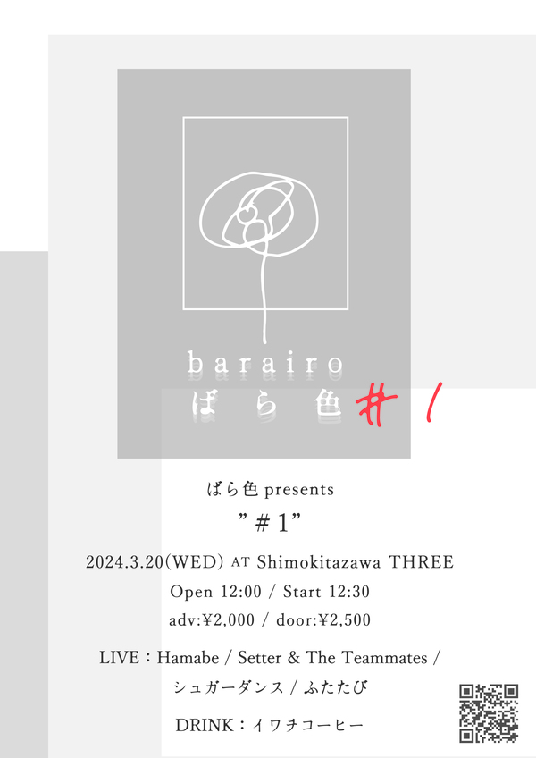 〈#1〉の出演者は、ばら色からこれまでに作品をリリースしたアーティストたちだ。昨年11月に“荒野”を配信リリースし、ラジオ「川谷絵音の約30分我慢してくれませんか」のイベント〈ENO-TUBE LIVE〉への出演も果たしたHamabe。アルバム『スロウダウン』をリリースした静岡の宅録アーティスト、Setter & The Teammates。配信シングル『木星金木犀』をリリースし、昨年12月に牧野容也とのツーマンライブを成功させたシュガーダンス。“仮初”“灯火”の2曲を収録した、カセットテープシングル『りぷらいず』をリリースしたふたたび。以上の4組が、イベントに出演する。また4組のライブに加えて、会場ではイワヲ・コーヒーによるドリンクの提供もある。