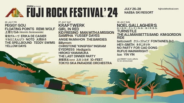 今回の発表でフェス初日にペギー・グー(Peggy Gou)、レミ・ウルフ(Remi Wolf)、上原ひろみ Hiromi’s Sonicwonder、電気グルーヴ、マカロニえんぴつ、大貫妙子、THE SPELLBOUND、テディ・スウィムズ(Teddy Swims)、イエロー・デイズ(Yellow Days)が決定したほか、2日目にはKID FRESINO、MAN WITH A MISSION、サンファ(Sampha)、THE BAWDIES、Billyrrom、Hedigan’s、折坂悠太(band)、スガ シカオ、10-FEET、東京スカパラダイスオーケストラが名を連ね、そして最終日にはノエル・ギャラガーズ・ハイ・フライング・バーズ(Noel Gallagher’s High Flying Birds)、オールマン・ベッツ・バンド(The Allman Betts Band)、キム・ゴードン(Kim Gordon)、betcover!!、クリープハイプ、HEY-SMITH、キタニタツヤ、toeが出演する。