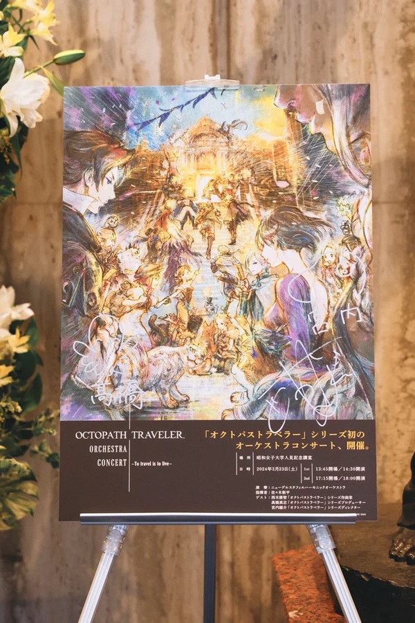旅立とう、君だけの物語へ──そんなキャッチコピーと共に世へ送り出された正統派RPG「OCTOPATH TRAVELER」。〈ドット絵〉と〈3DCG〉を交えた〈HD-2D〉と呼ばれる美麗なグラフィックと、8人の主人公が織り成す壮大な物語でも人気の同タイトルが5周年を迎え、記念企画として初のオーケストラ・コンサート〈オクトパストラベラー オーケストラコンサート -To travel is to live-〉が昭和女子大学人見記念講堂で開催された。指揮は、「黒執事」や「FINAL FANTASY VII REMAKE」などスクウェア・エニックス周辺のさまざまなオケコンでもタクトを握ってきた佐々木新平。演奏は、この日のためのスペシャル編成であるニューデルスタフィルハーモニックオーケストラ(〈オクトラ〉シリーズのプレイヤーならニヤリとするネーミング!)。そして、選抜された楽曲群は、〈オクトラ〉シリーズの音楽を支えてきた作曲家・西木康智による監修のもとでこの日のためにフル・オーケストラ・アレンジが施されたものとなる。