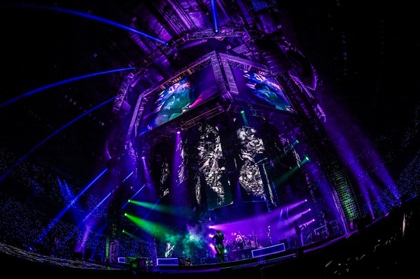 メリーゴーラウンドを思わせる円形のセンターステージと、そこから伸びる4本の花道。LEDスクリーンを備えた天蓋と台座の間を紗幕が覆っている。開演前から雨音を含むアンビエントなSEが流れていて、次第に雨足が強くなると場内は暗転。入れ替わりに、無線制御のオフィシャルグッズL’ライトが観客の手元で色とりどりに点灯する。いよいよ開演である。