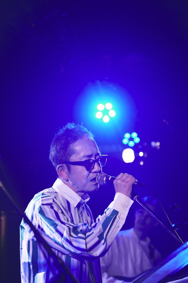 続いて登場した4人目のゲストはシンガーソングライターの青山陽一。青山は大田譲、西村哲也と80年代にGRANDFATHERSを結成。ファーストアルバム『Western-Charnande』(89年)は鈴木慶一、博文のプロデュースでメトロトロンからリリースされた。青山は大田とのデュエットで“Kucha-Kucha”、そして、単独で“ブルー”をカバー。歌声もさることながら情感豊かなギターも素晴らしく、ステージに戻ってきた鈴木は思わず「あんなギターを弾きたい!」と称賛。青山の演奏に触発されてか“プールサイド”をマイクを握りしめてソウルフルに熱唱した。