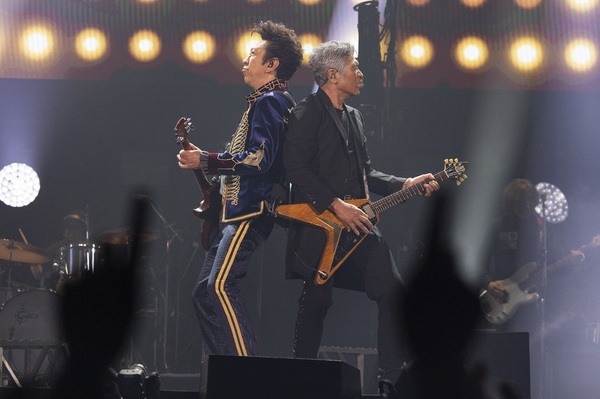 「今夜、共に被災地へエールを」。吉川が思いの丈を伝えた後に、続けて放たれたのはファーストアルバムのオープニングナンバー“PRETTY DOLL”。ヘヴィなリズムが心を揺らす“CRASH COMPLEXION”、布袋のギターリフが印象的な“NO MORE LIES”と続け、客席を更なる高揚に誘(いざな)う。一瞬の静寂をギターが引き裂くような“路地裏のVENUS”では、吉川がフライングVを抱えて、ゼマティスを握る布袋と並び立つ。味わい深いふたりのハモリと共に、彼らの〈音の融合〉が熱を帯びていく。
