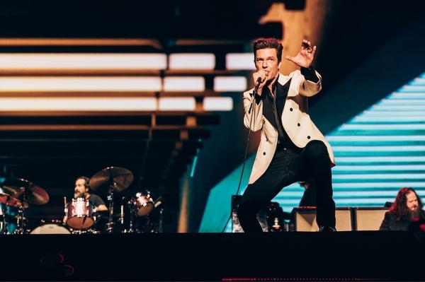 開演時刻が迫り、待ちきれない観客の拍手が何度か巻き起こる中でついに暗転、キーボードのKの電飾が浮かび上がると拍手は大歓声に取って代わる。颯爽とステージに登場したブランドン・フラワーズはドレッシーな白のジャケット姿で、そのスターのオーラにさらにどよめきが広がった。1曲目は“Somebody Told Me”で、助走なしのトップスタートだ。現在のキラーズのツアーは『Hot Fuss』20周年を意識してか、初期の3作(『Hot Fuss』、『Sam’s Town』、『Day & Age』)のナンバーを中心に代表曲を惜しみなく披露する、フェスティバル向きのベストヒット的なセットとなっている。しかし、ショウが始まって早々に“When You Were Young”をド派手な花火の特効付きでやってしまう前のめりのセットリストは、自他共に認める〈何故か日本でのみブレイクできなかった〉彼らの、〈今度こそここで成功したい〉という、リベンジマッチにも似た意気込みを感じさせるものだった。