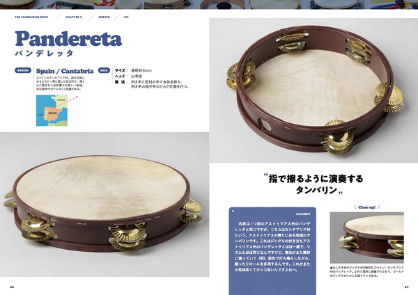 この本に集められたのは、主に後者のタンバリンの数々だ。椅子にしか見えないものから現代彫刻のような創作楽器まで、工芸品のような写真に目を奪われる。焼きたてのパンやケーキに見えるものもあれば、古代の宗教儀式や治療の道具としての歴史を想像させる毛皮ぐるみのものもある。そういえば、サイケな幻想を誘う“Mr. Tambourine Man”のモデルは聴衆に天国での救済を約束する街角の説教師という説もある。