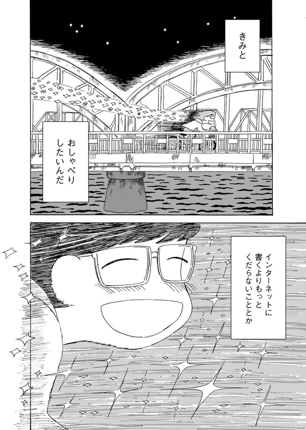 誰に向けるわけでもなく会社のぼやきをつぶやく高円寺くんと、それを個人的なメッセージとして受け止めたカイちゃんとのコントラストは、SNS時代のロマンスとも言える。ふたりは奇跡的に邂逅し、いろいろな出来事が起きるが、カイちゃんはすべてを投げ打って追いかけていく。都合のいい思い込みと、献身と、自己嫌悪と、後悔と、あきらめと、カイちゃんの感情は目まぐるしく変わっていくけれど、大人になっていくクラスメイトたちや、同世代の〈夢追い人〉千林くんといった登場人物は、カイちゃん自身をつねに見つめ直させる。自分がいてもいい世界はどこなのか(進行中)。いや、キミのいる世界の中に存在していたい。