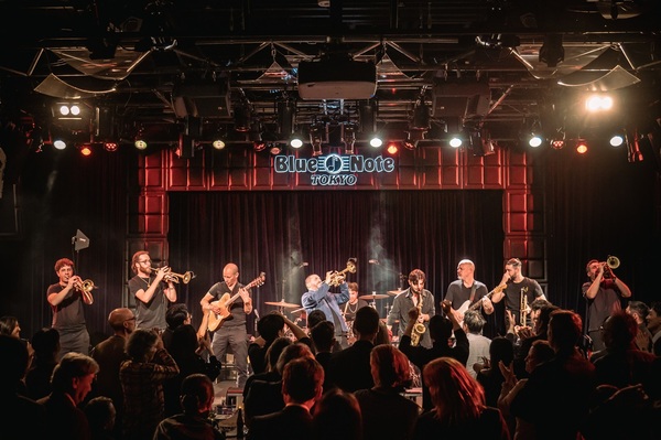直後にドラムのフィルインからアルバムの1曲目“The Proposal”でスタート。5本のトランペットとアルトサックスが折り重なり、キレのあるテーマを力強く吹き、ドラムのキメとばっちり同期すると、その音の分厚さと生々しさに早くも強烈な感動を覚えた。生で演奏を聴く醍醐味ってこういうことだよね。下手でエレアコ的なギターを弾いているギタリストが、グナワ(モロッコなど北アフリカの音楽)における弦楽器ゲンブリのような弾き方と音色でベース代わりに低音部を担っていたのも印象的だ。