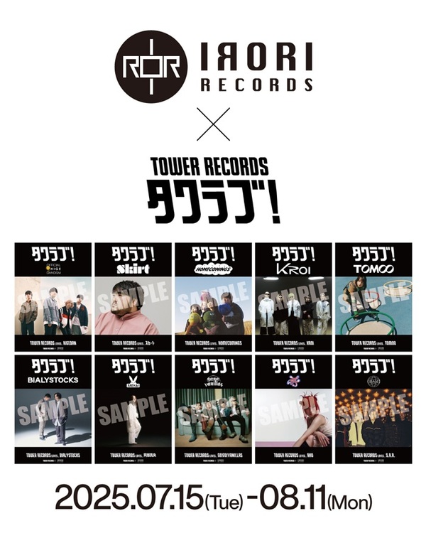 まずはタワーレコード全店で強力プッシュする企画〈タワラブ!〉にて、IRORI Recordsとのコラボポスター(B1サイズ)が掲出される。レーベルに所属する全10組をそれぞれ取り上げたポスターが、2025年7月15日(火)から8月11日(月)まで全店舗で展開される。