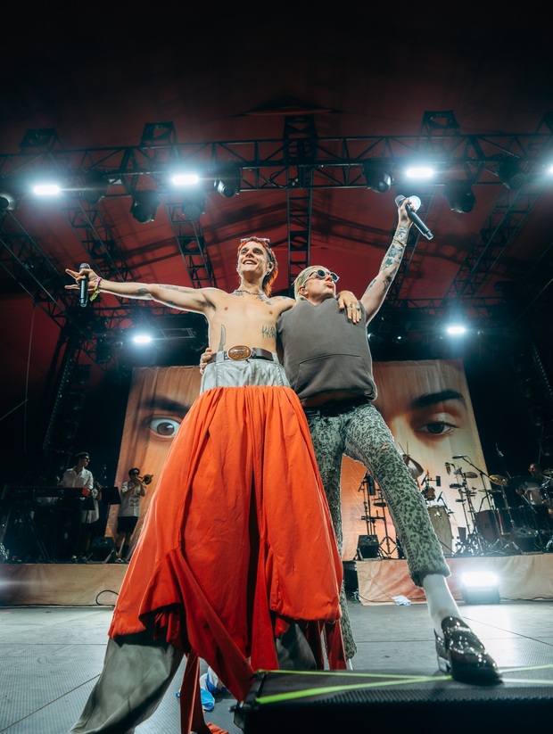 カトリエルとパコ・アモロソの顔を写した巨大な垂れ幕をバックにサポートバンドを率いて登場した2人は、真夏の苗場では到底考えらないアバンギャルドな衣装に身を包んでいた(着用ブランドはANREALAGE)。盛大なパーティーのはじまりを告げる“DUMBAI”から観客たちも声を張り上げる。ステージサイドのLEDビジョンには日本語訳の歌詞テロップが映し出され、彼らがスペイン語で何を歌い、どんな世界を生きているのかを理解することができるようになっていた。