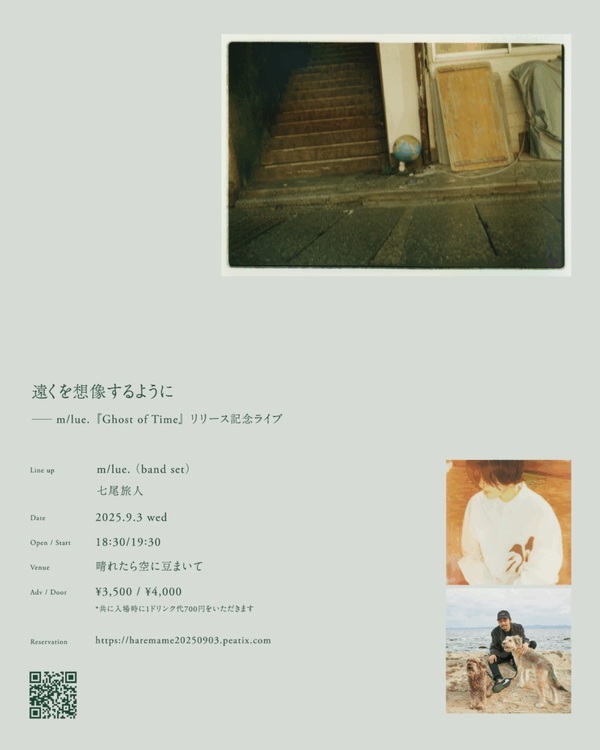 〈遠くを想像するように - m/lue.『Ghost of Time』リリース記念ライブ -〉が2025年9月3日(水)に東京・代官山の晴れたら空に豆まいてで開催される。