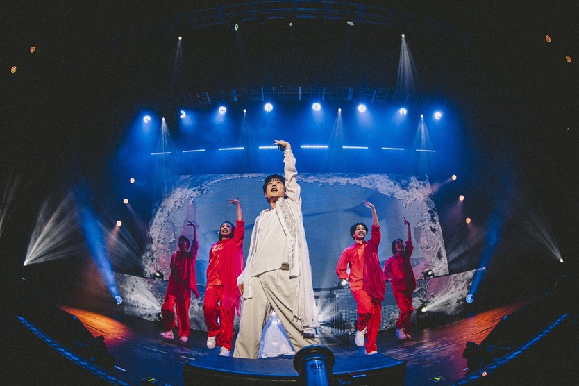 二宮の衣装はオールホワイト。シューズのみが赤色で、MATSURI、Kya73、YuTa、miharuら4人のダンサーたちの赤い衣装とのリンクを感じさせる。続く、“異世界協奏曲”(清野研太朗)では、勇者の冒険を想起させるファンタジックな映像をバックに、魔物を倒し、大きくジャンプ! 一転、アカペラから入る“Answer”(幾田りら)では、孤独と向き合い日々を紡いでいく〈僕〉の物語を切々と歌い上げる。