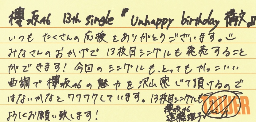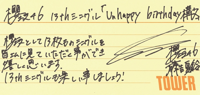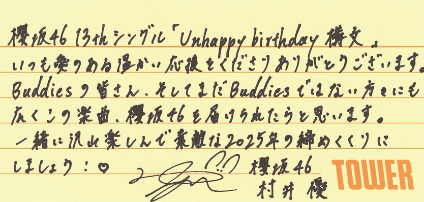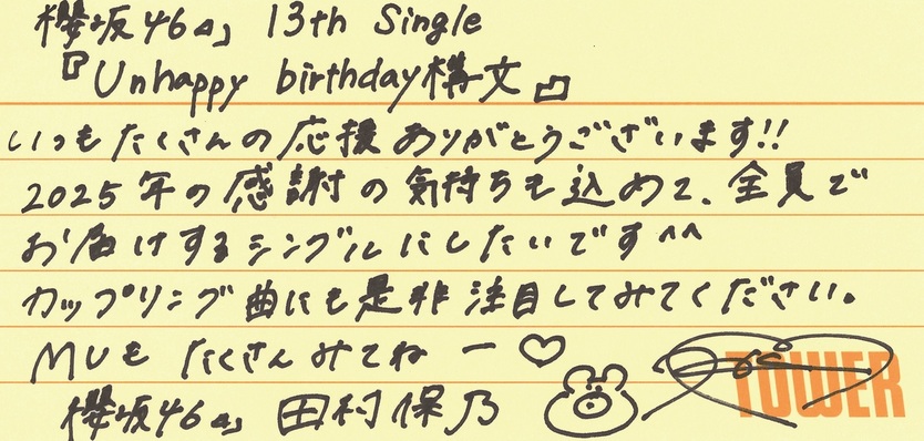 櫻坂46の13thシングル『Unhappy birthday構文』のリリースを記念して、タワーレコードではフリーマガジン「TOWER PLUS+ 櫻坂46 特別号」を発行! ここでは中面に掲載されている直筆コメント(転写)を掲載いたします。「TOWER PLUS+」はタワーレコード全店にて配布中です!※