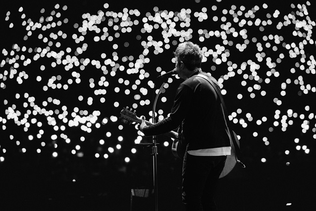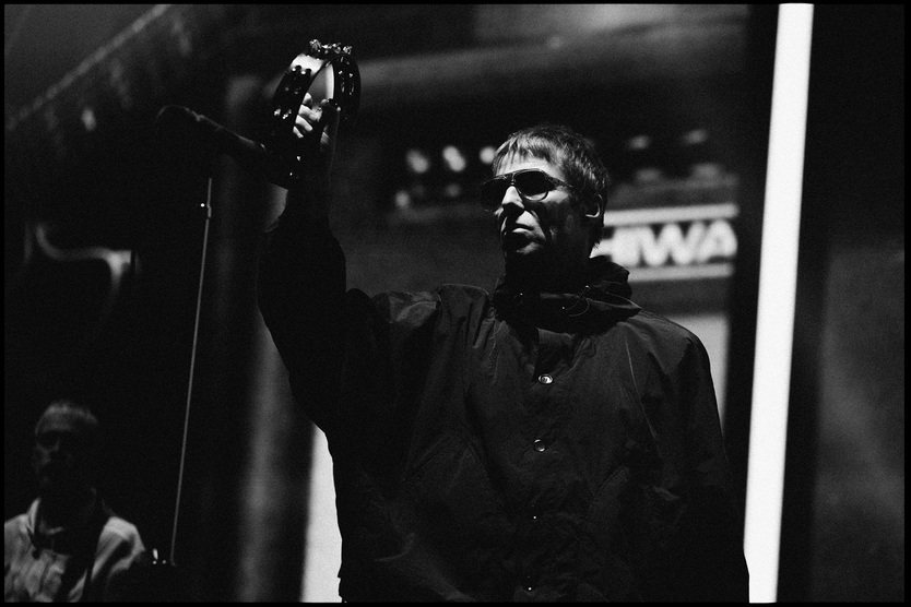 さあ、会場からの拍手と歓声が最高潮になりリアムがステージに登場! 右手にマラカス、そして左手には兄ノエルの右手を繋いで高く掲げて歩いている。ノエル自身は両手を上げ、その表情に目を映すと、笑顔だ。混じりっ気のない、純粋な喜びの笑顔。肉眼ではっきり目撃し、こちらまで嬉しくなる。そしてリアムはマラカスをパッと落とし、両手でアニキを抱きしめた。実感する――フェイクなんてとんでもない、見せかけの仲の良さでもない。このハグは、〈よし、やるぞ〉という兄弟たちの気合い注入の儀式だ。この夜が素晴らしいものになる予感のみ、そこにはあった。