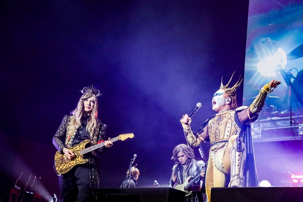 KAZAMIクロウリー(ドラムス)の合図が響いた瞬間、会場の空気が一変する。鋭く切り裂く一撃とともに始まった“審判の日”、そしてダミアン陛下も加わって演奏されたD.H.C.の地球デビュー曲“Babel”は、〈序章の嵐〉だった。