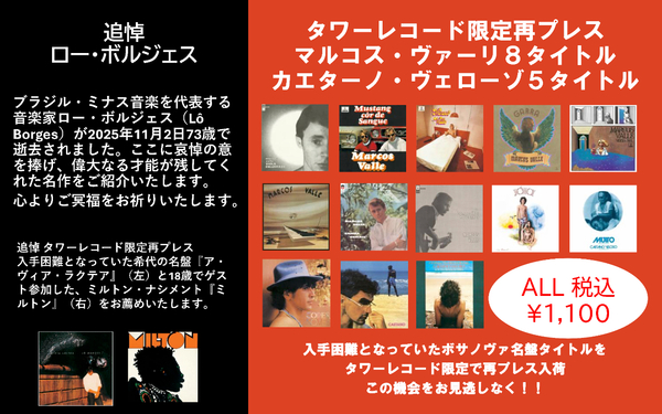 ブラジル・ミナス音楽を代表する音楽家ロー・ボルジェスの名盤『A Via-Láctea』をはじめ、マルコス・ヴァーリ、カエターノ・ヴェローゾといったアーティストの名盤が、タワーレコード限定で追加プレスされた。一挙15タイトルが、数量限定で再入荷している。
