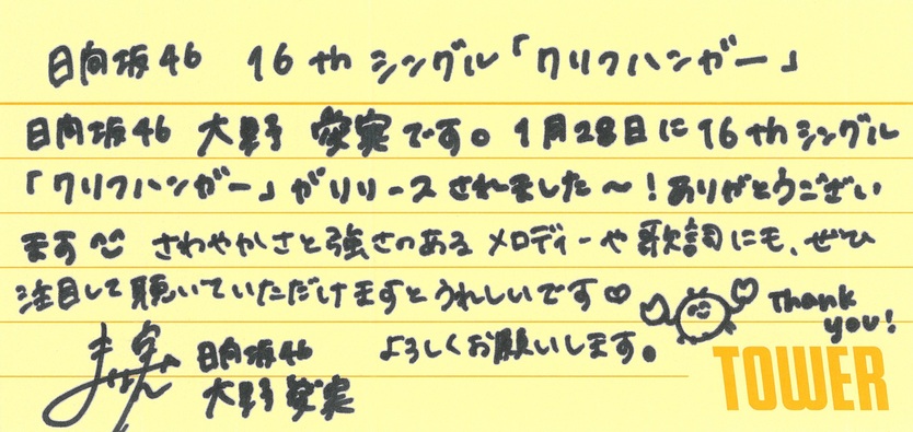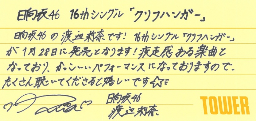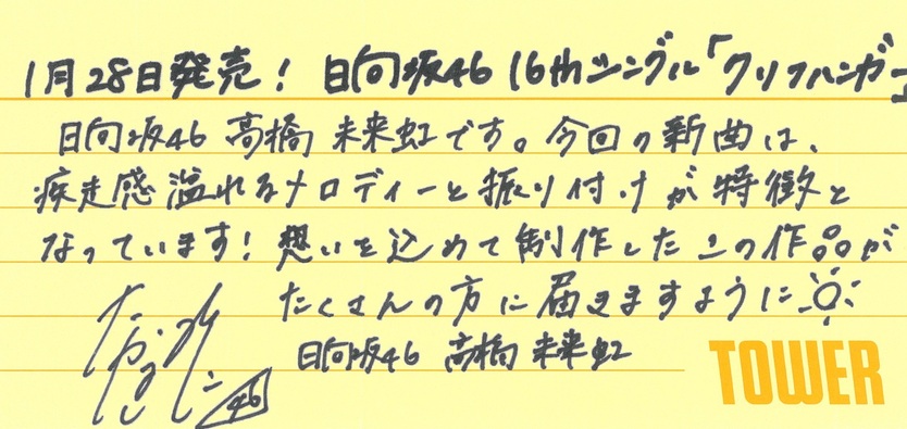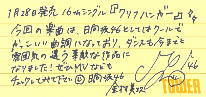 日向坂46の16thシングル『クリフハンガー』のリリースを記念して、タワーレコードではフリーマガジン「TOWER PLUS+ 日向坂46 特別号」を発行! ここでは中面に掲載されている直筆コメント(転写)を掲載いたします。「TOWER PLUS+」はタワーレコード全店にて配布中です!※