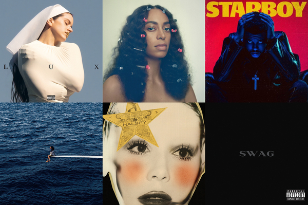 左から、ソランジュの2016年作『A Seat At The Table』(Saint/Columbia)、ウィークエンドの2016年作『Starboy』(XO/Republic)、SZAの2022年作『SOS』(Top Dawg/RCA)、ムスタファの2024年作『Dunya』(Jagjaguwar)、ホールジーの2024年作『The Great Impersonator』(Columbia)、カリ・ウチスの2025年作『Sincerely,』(Capitol)、ジャスティン・ビーバーの2025年作『SWAG』(Def Jam)、ダニエル・シーザーの2025年作『Son Of Spergy』(Republic)