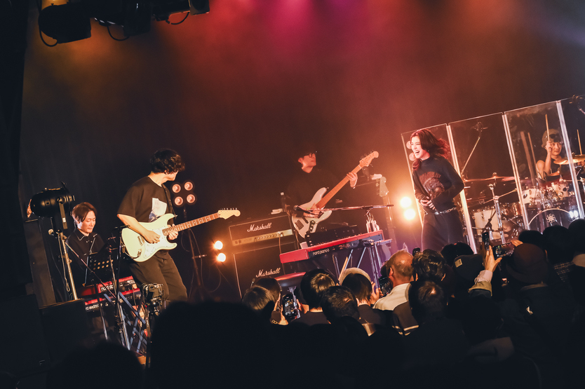 「1年ぶりのLIQUIDROOM、みんなの声を聞かせて!」。それがこの日の第一声。歓声があがるなか、コーラスのHarunaが観客に手拍子を促し、“Day 6”から一転してアップテンポの曲がスタート。未だ音源化はされていないが、ライブではこれまでにも何度か歌ってきた“80’s”だ。ザ・ウィークエンドを想起させるエレクトロポップロック調のこの曲を、XinUはマイクスタンドを持って動きながら歌う。終盤ではロングトーンも。アレンジがまた少しだけ変わって楽曲自体が進化したようだ(早く音源でも聴いてみたい)。ここでさらに会場の温度を上昇させるべく、明るい夏ソング“触れる唇”を。今回はダンサーの登場はなく、純粋に楽曲と演奏と歌の力で盛り上げた。プリセットされたホーンの音も効果的だった。