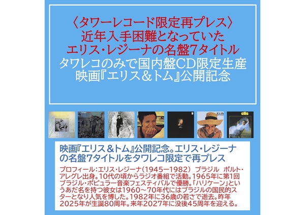 そんなエリスとアントニオ・カルロス・ジョビンの名作『エリス&トム』を題材にしたドキュメンタリー映画「エリス&トム ―ボサノヴァ名盤誕生秘話―」が2026年3月6日(金)から公開される。これを記念して、近年入手困難となっていたエリスのCDがタワーレコード限定で再入荷。