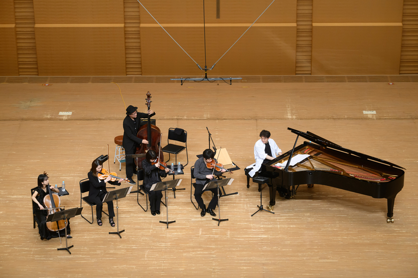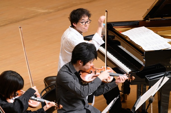 コンサートのタイトルにある〈ソルト・ストリングス〉というのは、塩谷が2011年に開催した自身のコンサートのために初めて編成した、バイオリン × 2、ビオラ、チェロ、コントラバスから成る弦楽器集団。今回の参加メンバーは、人気ストリングスポップバンドRainbow Septetのリーダーでもある1stバイオリンの藤堂昌彦を筆頭にして、2001年、2002年のリゾナーレ音楽祭での奨学金獲得を果たしている2ndバイオリンの徳永友美、第13回コンセール・マロニエ21弦楽部門で優勝に輝いたビオラ奏者の金孝珍、パリ地方音楽院の最高課程を首席卒業しているチェリストの稲本有彩という、いずれも数多くのオーケストラへの参加やさまざまなアーティストへのサポート、CM、TVドラマ、映画音楽の演奏など、多方面で活躍し、塩谷がかねてから全幅の信頼を置くトップクラスの弦楽器奏者だ。