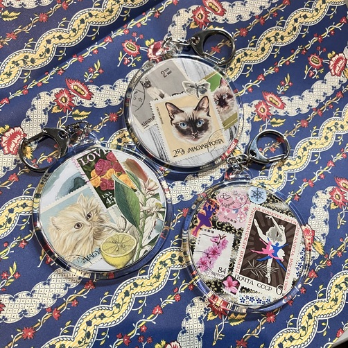 世界中から集めた⾯⽩い切⼿や素材を使ってコラージュを作り! ⾃分だけの⽸バッジやキーホルダーとして持ち帰ることができます。