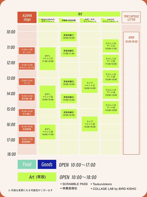 〈SCRAMBLE FES〉では、ASAMA Stageでのライブパフォーマンスに加え、多彩なアートとの出会いやワークショップ、フード&ドリンクやグッズ店舗でのお⾷事・お買い物をお楽しみいただけます。