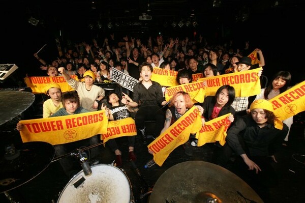 そしていよいよこの日のトリ、タワレコタオルを掲げつつ彼女 in the displayの面々が登場すると、満員の会場で歓声を上げるファンたちの顔が笑顔と期待感で満たされていく。押し引き抜群で各楽器に見せ場を作り、ここぞという所でヴォーカルをしっかりと前面に出す卓越したアレンジが見事! キャッチーかつポップであることと真摯に対峙する姿勢は、間奏でドラム以外の全員がファンと共に垂直に飛び跳ねる2曲目“Black hawk down act.3”や会場全体が両手を挙げつつ雄叫びを上げる“CRAZY DIAMOND”など、全力で楽しみ楽しませようとするステージングからも存分に伝わる。ヴォーカルの稲木亮介が「自己紹介がてら、今日は喋らずに、いっぱい曲やっちゃっていいですか!」と叫ぶと大歓声で応えるオーディエンス。“Paradise Lost”などブレイクを多用するメリハリの効いたナンバーでさらに盛り上げると、7曲目の“ECOHES”とアンコールでの“GOLD EXPERIENCE”では派手な煽りや演奏中のジャンプを封印、一心に声を張り上げ楽器をかき鳴らす姿と力強いサウンドで観る者の胸を打つ。トリを飾るにふさわしい堂々たるパフォーマンスを見せつけ、熱気溢れる一夜を締めくくった。