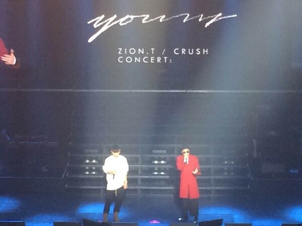 お色直しが終わると、ふたたびメイン・アクトの登場。ZION.T“양화대교 (楊花大橋)”とCRUSH“Sofa”という両者の最新シングルとなるバラードを交互に歌った後は、CRUSHがフィーチャーされているZION.T“뻔한 멜로디 (Two Melodies)”を2人揃って披露しました。ここではオリジナルに近いアレンジがなされたヴァージョンで。各々の歌唱パートごとに2人の立ち位置が結構な高さまでせり上がったり下がったりする(わかるかな?)という、高所恐怖症の私としては見てるだけでもなかなかにスリリングな演出――今回のライヴはVJを含めてこういった演出面のアレがややアレでして……センスの違いでしょうか。