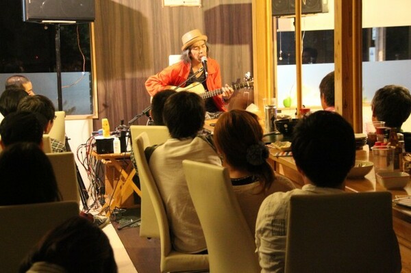 化学調味料をいっさい使わない無化調ラーメンにこだわるこのお店でユウジさんがライヴを行うのは今回が初めてではない。昨年末に行った第一回目は入りきらないほどのお客が押し寄せ、大盛況のうちに終わったとのこと。そして今回は、勝浦の〈ゆや〉と同様に、開催する告知を出しただけでほぼ定員が埋まったそうで、初めて濱口祐自のライヴを体験する方も少なくないようだ。店の広さからすると、40人も入れば満杯。ただ町の規模を考えれば、集客を難なくクリアできたことはやはり大したもの(ここら辺での40人は、都市部だと3倍の120人ぐらいに匹敵すると誰かが言ってた)。その客のなかには、ウチの両親も含まれている。ユウジさんの新参ファンであるふたりから、この店でのライヴが素晴らしいってこと、ラーメンがめっちゃ美味しいことをあらかじめ聞かされていたのだ。