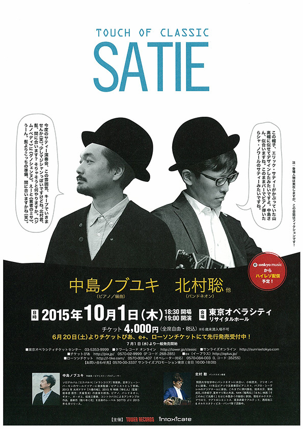 すでにお知らせしている10月1日(木)東京オペラシティ リサイタルホールでのエリック・サティ演奏会〈TOUCH OF CLASSIC-SATIE-〉、チケットが本日発売となりました! 作曲家でピアニストの中島ノブユキさんとバンドネオン奏者の北村聡さんを迎え、エリック・サティを存分に味わえる贅沢で刺激的な一夜!
