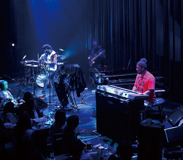 舞台の三辺をかこむビルボードライブ東京の2階の私の位置は下手から上手へ横ざまに据えたドラムセットの正面にあたるので、やたらとマーク・コレンバーグに目がいってしまうのは仕方ない。ひたすらリズムを刻み、グルーヴの基軸にたいし自在に前後しながら、コレンバーグはときに激しくときにすこしだけ激しく、というか細やかなぬきさしで音の場をつくり、その右に視線を転じるとアール・トラヴィスはもくもくとリズムを刻み、上手でカルテットを指揮するごとくみやるロバート・グラスパーの左前、中央よりにはショルダー・キーボードとサックス類をもちかえるケーシー・ベンジャミンがオートチューナブルな歌声で見事なほど真っ白な歯列をのぞかせ歌いあげる。ロバート・グラスパー・エクスペリメントのこのたびの来日公演は、すでに大御所の風格ただよう彼らの去年につづく来日公演だが、何度目であっても凱旋公演めいているのはロバート・グラスパーがジャズの現在のまごうことなき中心にとどまりつづけているからにちがいない。