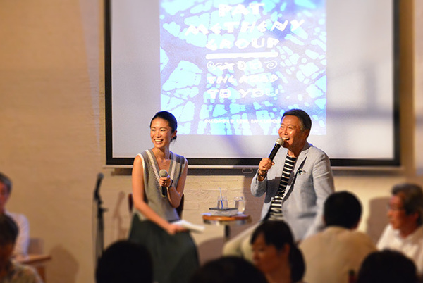そんな具合でトークも盛り上がるなか、「〈Blue Note JAZZ FESTIVAL in JAPAN〉にジェフ・ベックが出演決定、パット・メセニーとの初共演も実現するかも!?」という大ニュースがステージに届く。「お互い音にこだわるギタリストなので、どう噛み合うのか想像するだけでも楽しみ」と小倉さんも興奮ぎみで、嬉しい知らせに会場は大いに沸いた。「変拍子をそう思わせないほど自然に聴かせるのがパットの凄さ」と語る小倉さんは、「本領発揮のソロ・プレイと、終わったあとの拍手も聴きどころ」と紹介も交えながら、最後に93年のライヴ盤『The Road To You (Recorded Live In Europe)』より“Letter From Home”と“Third Wind”を続けてプレイ。完璧なユニゾンを聴かせる熱演に会場中が聴き入り、曲が鳴りやむとリアルな拍手も巻き起こった。日本中のお茶の間を賑わすだけあり、ビギナーにも親切丁寧な小倉さんの解説ぶりは実にお見事。まるでパットが弾くギターのように流麗な語り口で、濃密な40分弱はあっという間に感じられた。