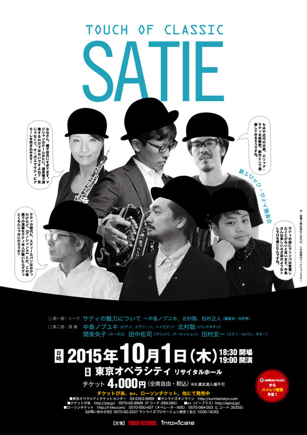 intoxicateは、10月1日(木)に東京オペラシティ リサイタルホールにて、作曲家エリック・サティにスポットを当てたコンサート〈TOUCH OF CLASSIC-SATIE-〉を開催します。 出演は作曲家でピアニストの中島ノブユキとバンドネオン奏者の北村聡、そしてさらに、関美矢子(オーボエ)、田中佑司(マリンバ、パーカッション)、田村玄一(スティールパン、ギター)の3名の出演が決定しました! 中島ノブユキともCDやライヴなどで共演してきた納得のメンバーで繰り広げる、新しいエリック・サティの世界に、ぜひ触れにきてください。TOUCH OF SATIE!