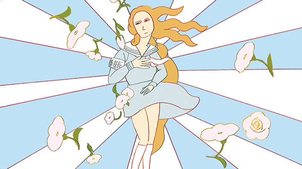 音楽も独特で、耳から離れない曲と絶妙な歌詞。例えば、ボッティチェリの「ヴィーナスの誕生」を基にした《委員長はヴィーナス》は昭和歌謡風、江戸時代の名作「見返り美人図」を基にした《見返りすぎてほぼドリル》は太鼓や鉦を使って江戸の人情コメディのような仕上がり。ヘタウマな(褒め言葉です)うたを引き立たせるア・カペラ・コーラスグループのジョリー・ラジャーズの渋いコーラスは、ラップにも対応。なんともいえないバランスで、ニヤリとしながら歌詞を追ってしまう。