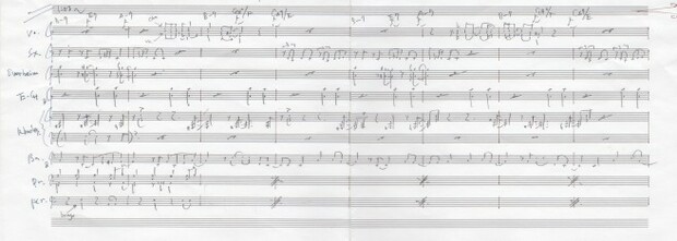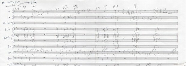 譜例1は、イントロのリズム隊が一団となってシンコペートするリフを奏し、偶数小節で現れるソリストと会話しているような場面です。