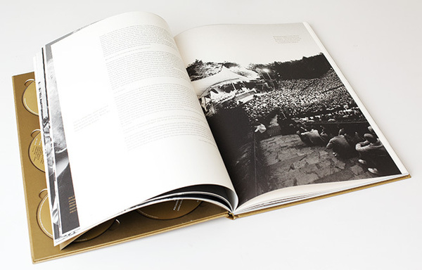 届いてみてその大きさに驚かされた。ベルリン・フィルハーモニー管弦楽団が自主制作したCD付き80ページの豪華本『IM TAKT DER ZEIT (時代のタクト)』である。ゴールドの装丁をもつ本のサイズは縦41センチ×横28.5センチもあり、ベルリン・フィルの長い伝統を物語る貴重な写真の数々が1~2ページ大に印刷されている。その写真の内容は初代常任指揮者フォン・ブレナー時代のプログラムに始まり、伝説的名指揮者ニキシュの指揮姿2枚、フルトヴェングラーと団員の集合写真(2ページ大)、ベルリンにトスカニーニ、ワルター、クレンペラー、フルトヴェングラー、クライバーが一堂に会したときの有名な写真(2ページ大)、若きホーレンシュタインによるブルックナー第7録音風景、第2次大戦後に廃墟の中で演奏するチェリビダッケとベルリン・フィル、現在のフィルハーモニー竣工時の写真、そしてアバド、ラトル時代へと続く。これらのモノクロ写真の印刷品位の高さは、思わず本をさばいて、お気に入りの写真を額縁に入れて飾りたくなるほどである。