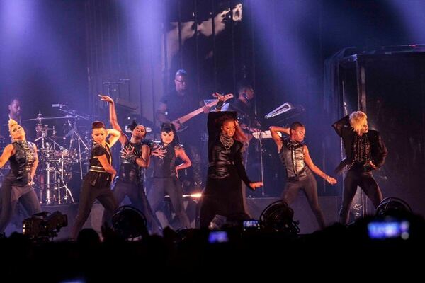 中盤はバラード中心の構成。ジャネットの吐息までも聞こえそうなほど艶めかしい新曲“No Sleeep”や、名作『Janet.』から8週全米1位を獲得した“That’s The Way Love Goes”などを次々に熱唱。その後、全米1位を獲得した“Black Cat”の歪んだギターが大音量で鳴り響くと客席は再び絶叫。さらに亡き兄マイケルとのコラボ曲“Scream”、そして“Rhythm Nation”を披露し、ライヴは大熱狂のうちに幕を閉じた。