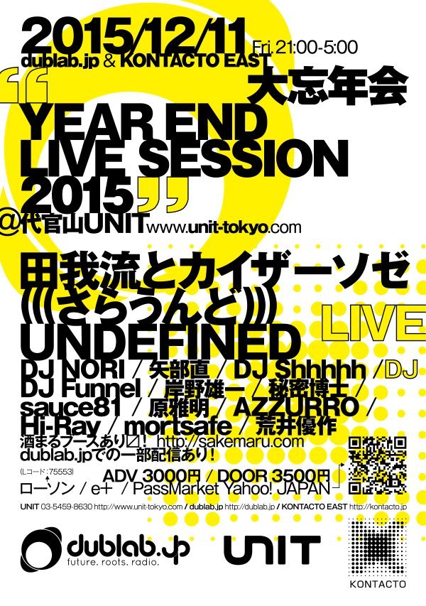 ネットラジオ・dublab.jpとイヴェント企画/PR会社のKONTACTO EASTによるオールナイト企画〈YEAR END LIVE SESSION 2015〉が12月11日(金)に東京・代官山UNIT/SALOONで開催される。
